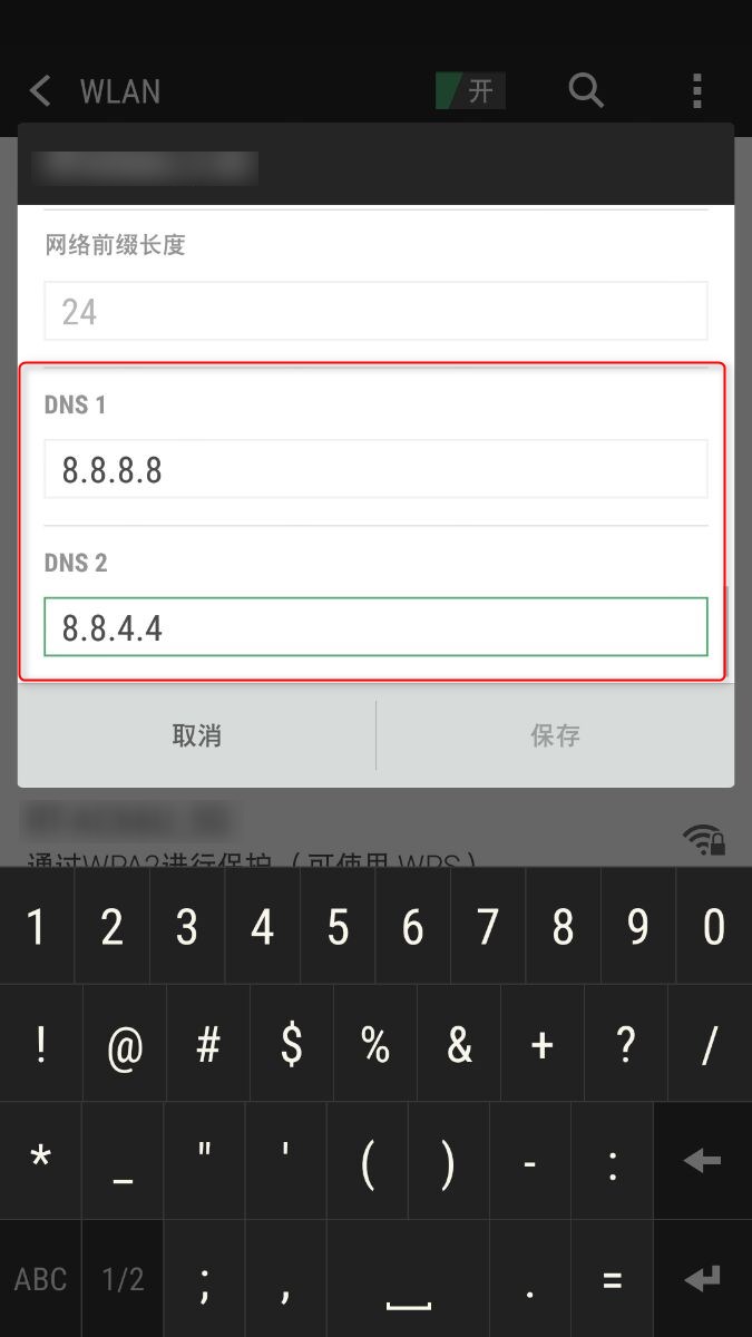 4. 在该 Wi-Fi 网络详情部分向下滚动找到 “ DNS ” 选项部分, 在弹出的键盘上输入您需要更改的 DNS 数值,使用 8.8.8.8